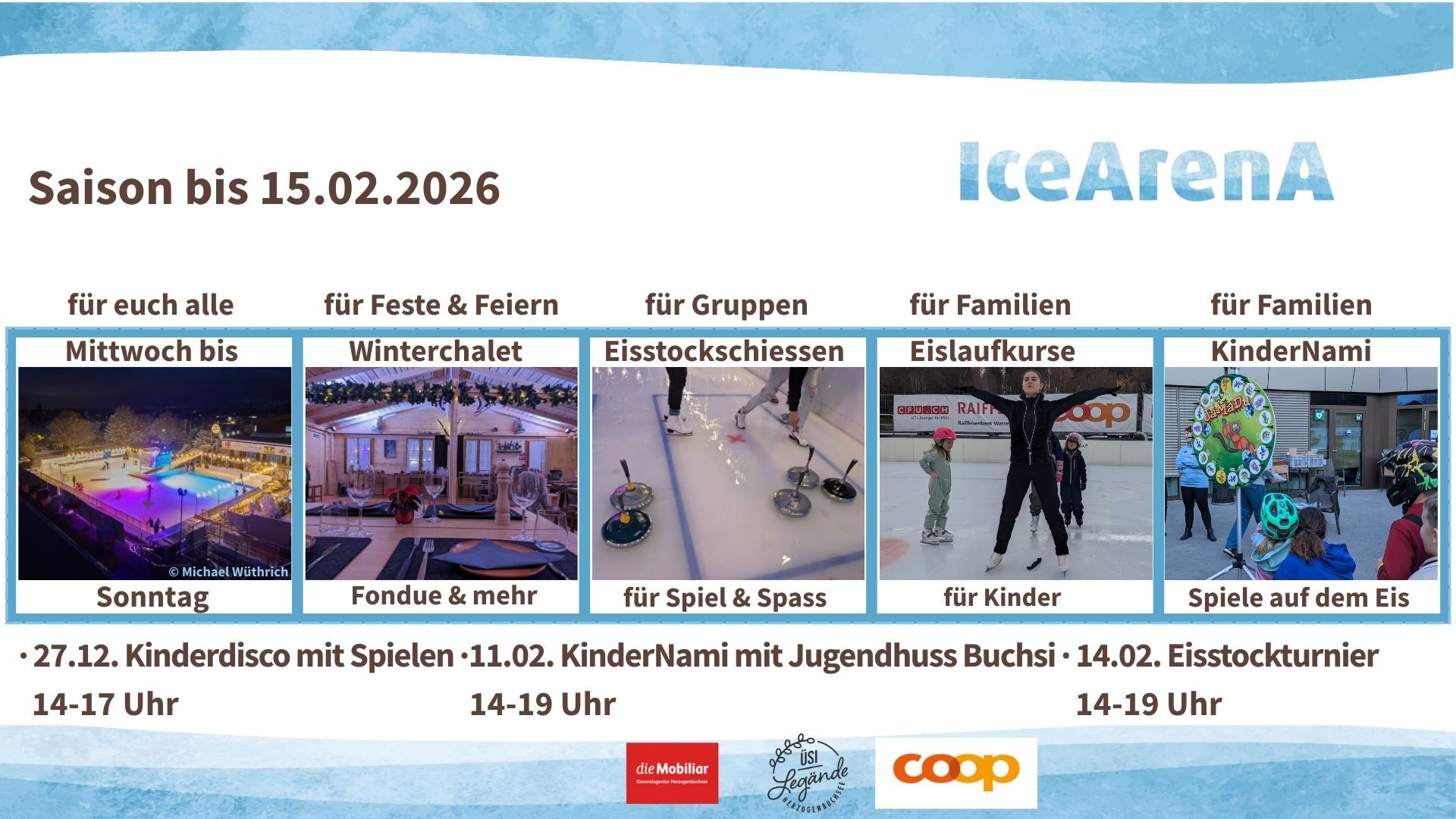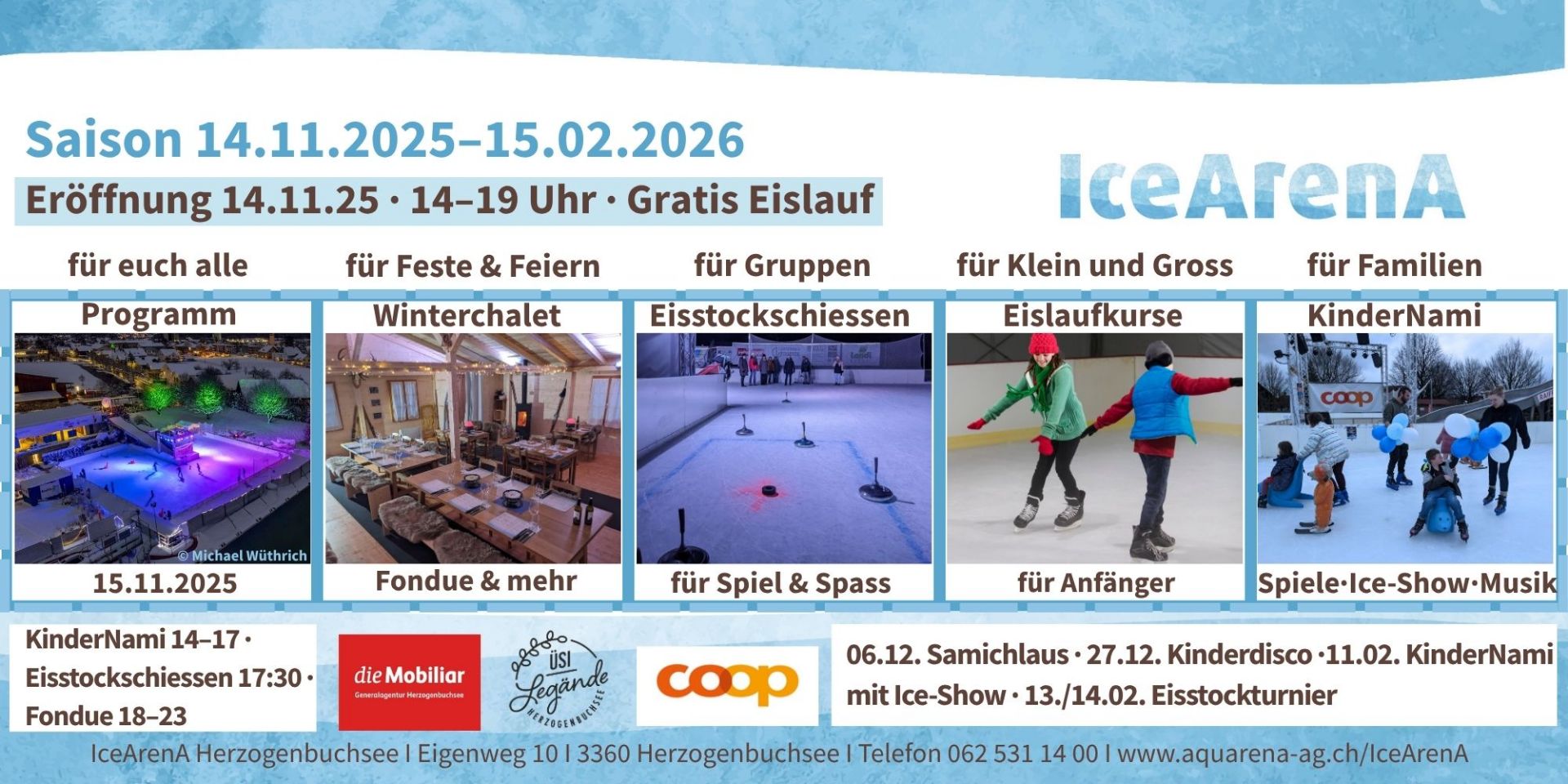 Eine mobile Kunsteisbahn auf dem Gelände des Freibads ist das neue Freizeitangebot in Herzogenbuchsee. Auf 660m² befinden sich zwei Eisfelder – eines für Schlittschuhlaufen und eines für Eisstockschiessen. Dank einer leistungsfähigen Wärmepumpe kann die dabei entstehende Wärme, durch das kühlen der Eisbahn, effizient ins Warmwasserbecken eingespeist werden. Die Kunsteisbahn ist von November bis Februar in Betrieb. Zusätzliches Highlight bietet das gemütliche Winterchalet mit Fondue-Abende für Firmenanlässe und Feste mit bis zu 54 Personen direkt neben der Eisfläche.