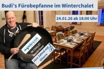 Am 24. Januar ab 18:00 Uhr schwingt Budi seine Kochkünste im gemütlichen Winterchalet! 🍽️✨ 🎵 Special Guest: Jüre Zahnd an der Gitarre!