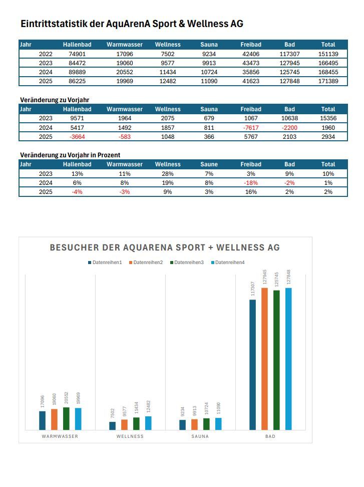 Die Aquarena Sport & Wellness AG in Herzogenbuchsee konnte im Geschäftsjahr 2024 ihren Umsatz dank steigenden Besucherzahlen auf Fr. 2'306'507 steigern. Trotzdem resultiert erneut ein operativer Verlust, der auf den nicht kostendeckenden Schwimmbetrieb von Frei- und Hallenbad zurückzuführen ist. Für die zweite Hälfte des Jahres 2025 zeichnet sich ein Liquiditätsengpass ab. Der Verwaltungsrat hat einen Entwicklungsplan erarbeitet, der die Zukunft der Badi langfristig sichern soll. Der Plan wurde durch die Gemeinde Herzogenbuchsee und externe Wirtschaftsexperten geprüft.
